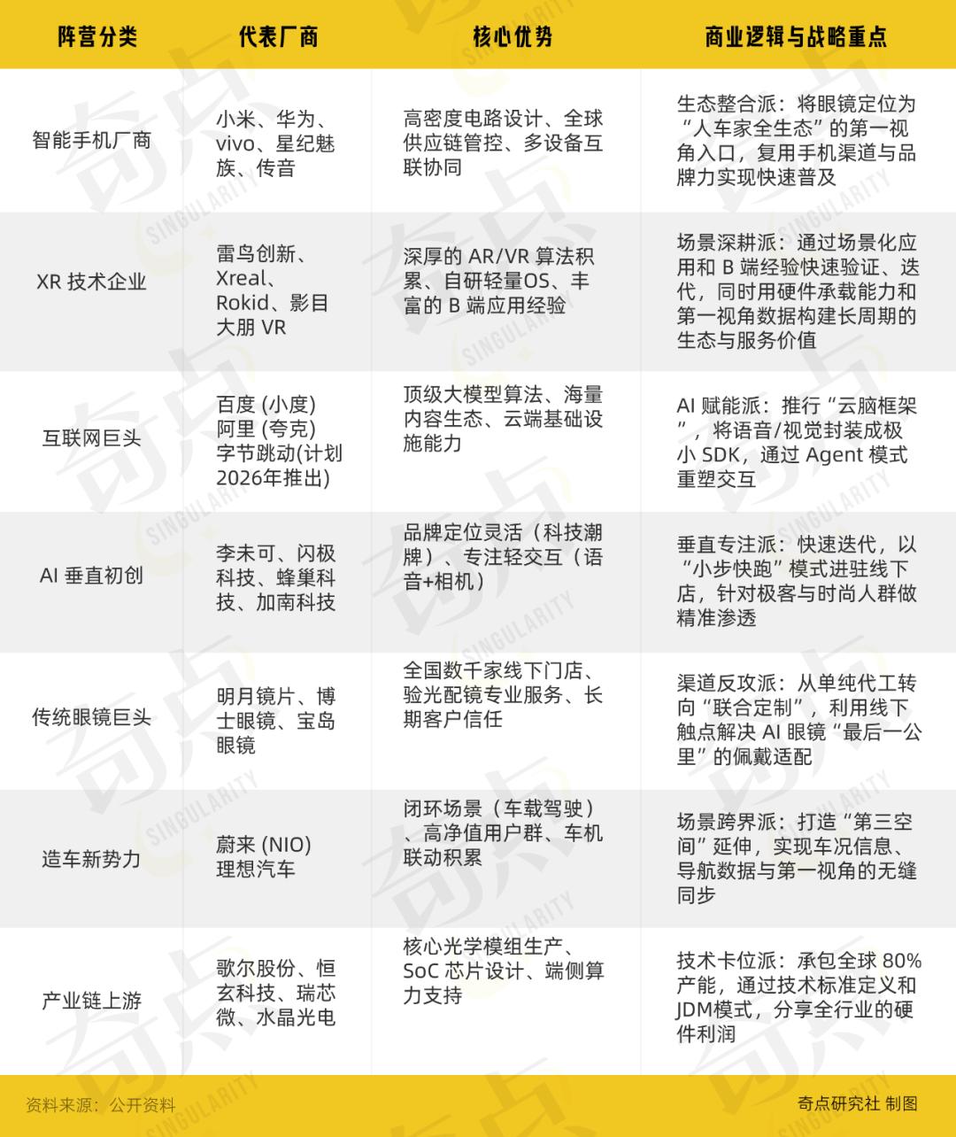 据奇点统计,国内入局AI眼镜赛道的玩家可以大致划分为七类。