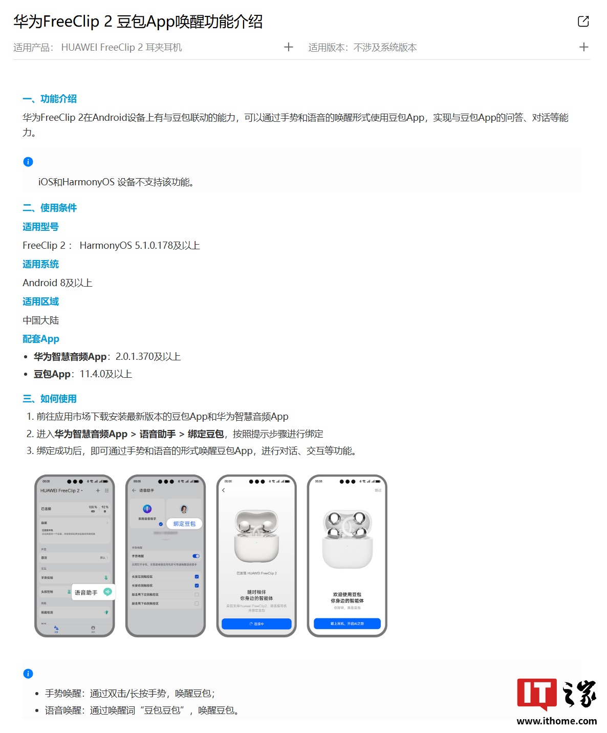 IT之家 1 月 25 日消息,华为官网显示,华为 FreeClip 2 耳夹耳机在 Android 设备上有与豆包联动的能力,可以通过手势和语音的唤醒形式使用豆包 App,实现与豆包 App 的问答、对话等能力(iOS 和 HarmonyOS 设备不支持该功能)。