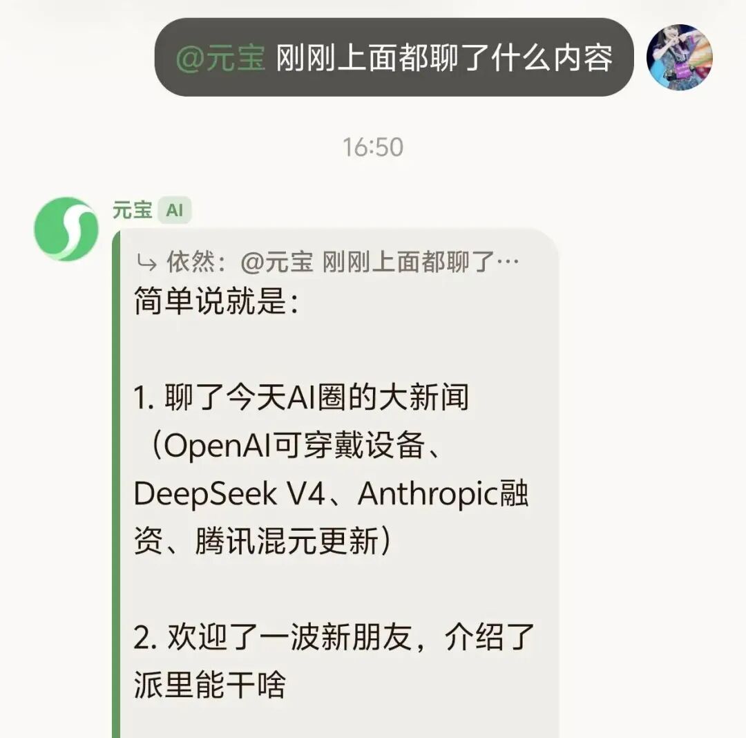 在说话语气上,可以看出群里的元宝说话语气明显区分于对话框回答的一本正经,回答方式更接近人类的轻松俏皮。比如让它总结内容,它会轻松地回“来了”,没有“假人”的生硬感。