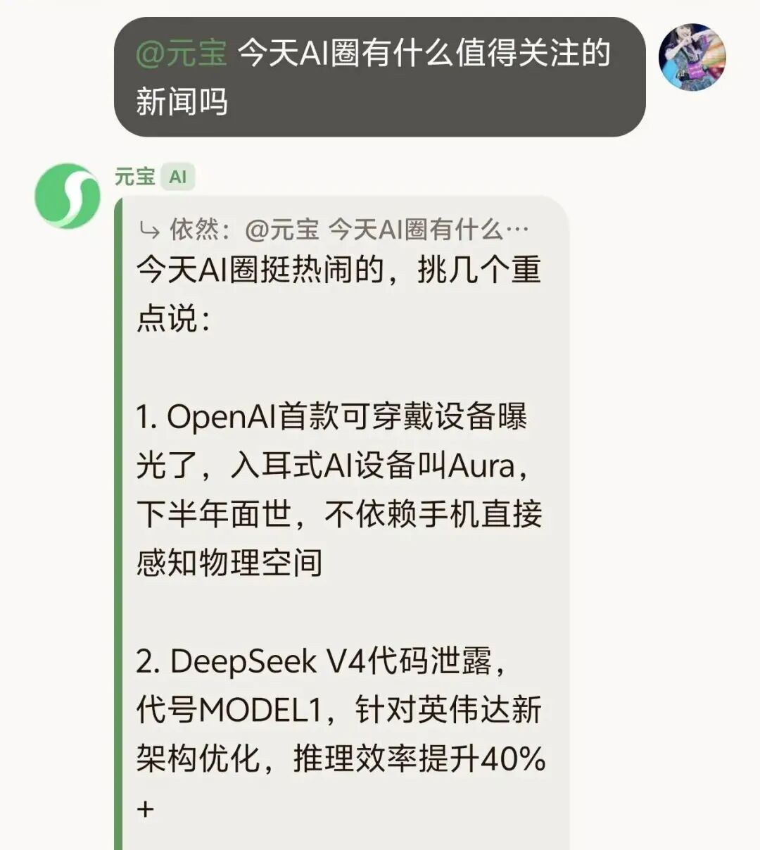 但在测试过程中,元宝的回答就不太智能,还是存在错误的硬伤。当光锥智能让元宝总结一份今天AI圈发生的新闻,它给到的第一个新闻就是OpenAI的AI硬件入耳式耳机Aura被曝光。但实际上,这不是今天发生的内容,Aura也是OpenAI几个月前被暴露出来的浏览器代号,更对应AI音频和最近发布的是代号“Sweet Pee”。