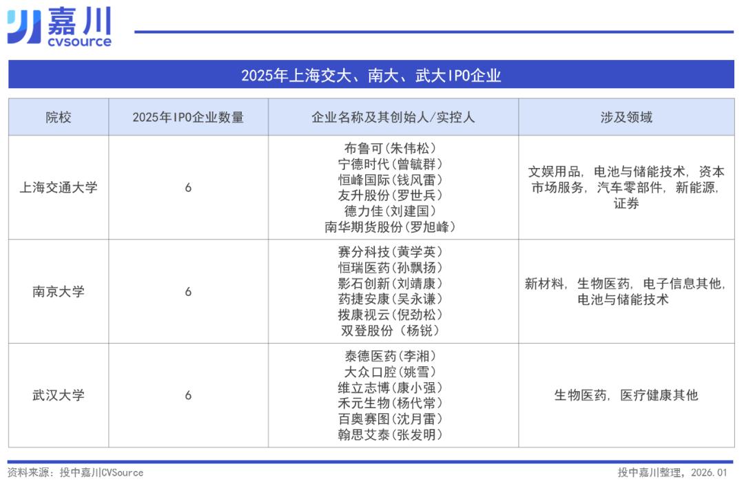 在去年国内高校的IPO版图中,上海交通大学、南京大学与武汉大学表现亦相当不俗,各自均有6家企业成功上市,展现出强劲的校友创业能力与科研成果转化效率。