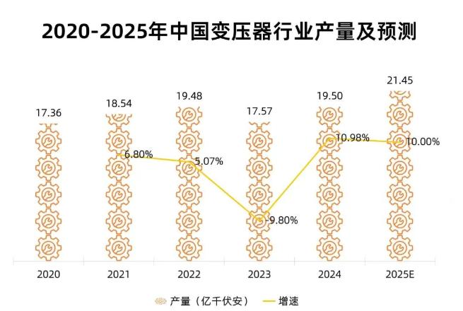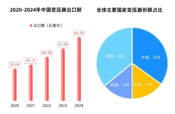 而变压器作为电力系统关键设备,广泛应用于输配电、新能源、轨道交通等领域,2024年产量达19.50亿千伏安,预计2025年将增长10%至21.45亿千伏安。出口持续向好,2020—2024年出口额从32.64亿美元增至64.30亿美元,复合增长率18.47%,全球份额达35%,已实现对欧美市场的规模化覆盖。