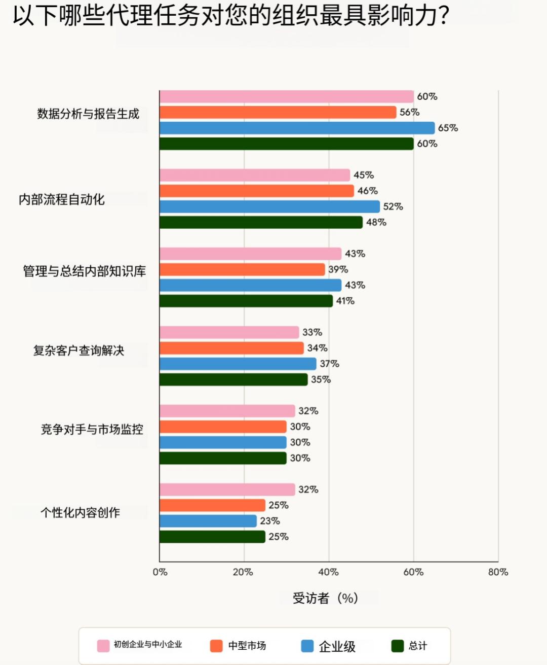 除了编码之外,影响最大的人工智能智能体用例是数据分析和报告生成(60% 的人表示这是最具影响力的任务之一)以及内部流程自动化(48%)。企业对数据分析和报告生成尤为看好,65% 的企业认为这些是高影响力的应用。