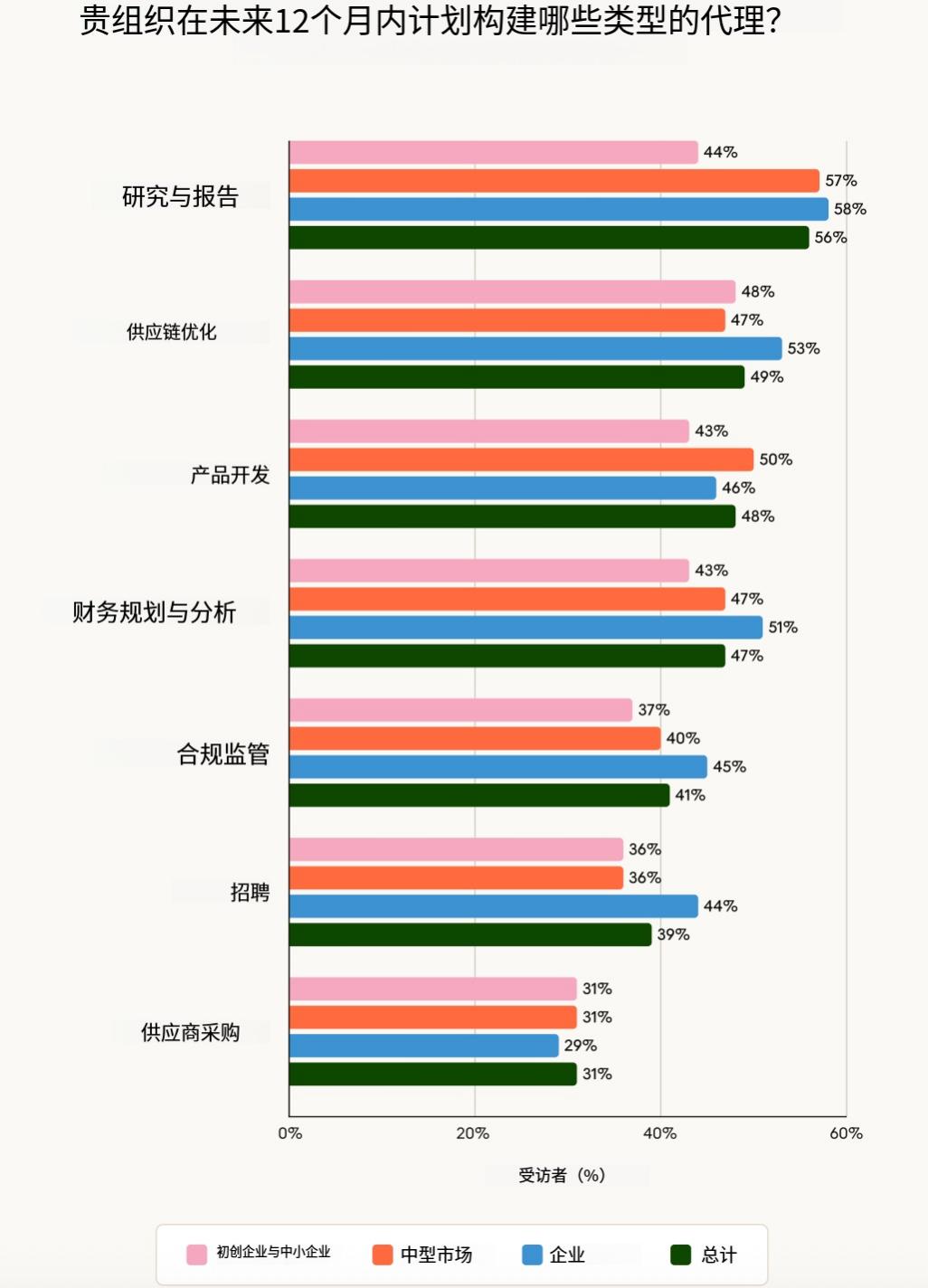 未来 12 个月,各组织期望人工智能智能体的应用能远远超出工程和信息技术职能。56% 的组织计划优先采用人工智能智能体进行研究和报告工作,尤其是在中型市场和企业组织中,紧随其后的是供应链优化、产品开发和财务规划。计划应用场景的广度表明,人们正从将人工智能智能体视为特定部门的工具,转向将其视为企业级基础设施。