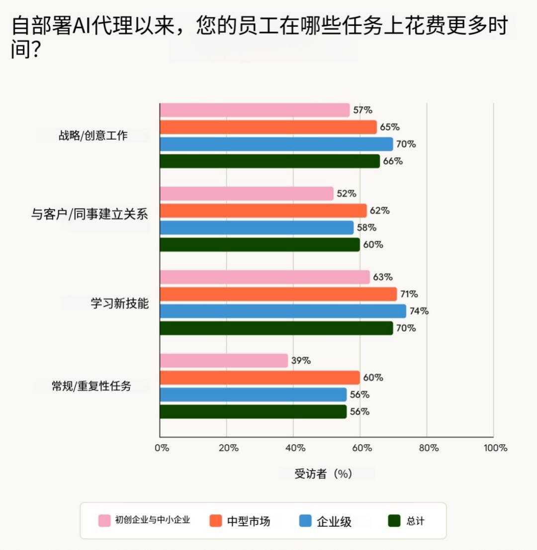 智能体正在改变员工的时间分配方式 —— 更多地关注战略工作(66%)、人际关系建设(60%)和技能发展(70%),而非日常执行。
