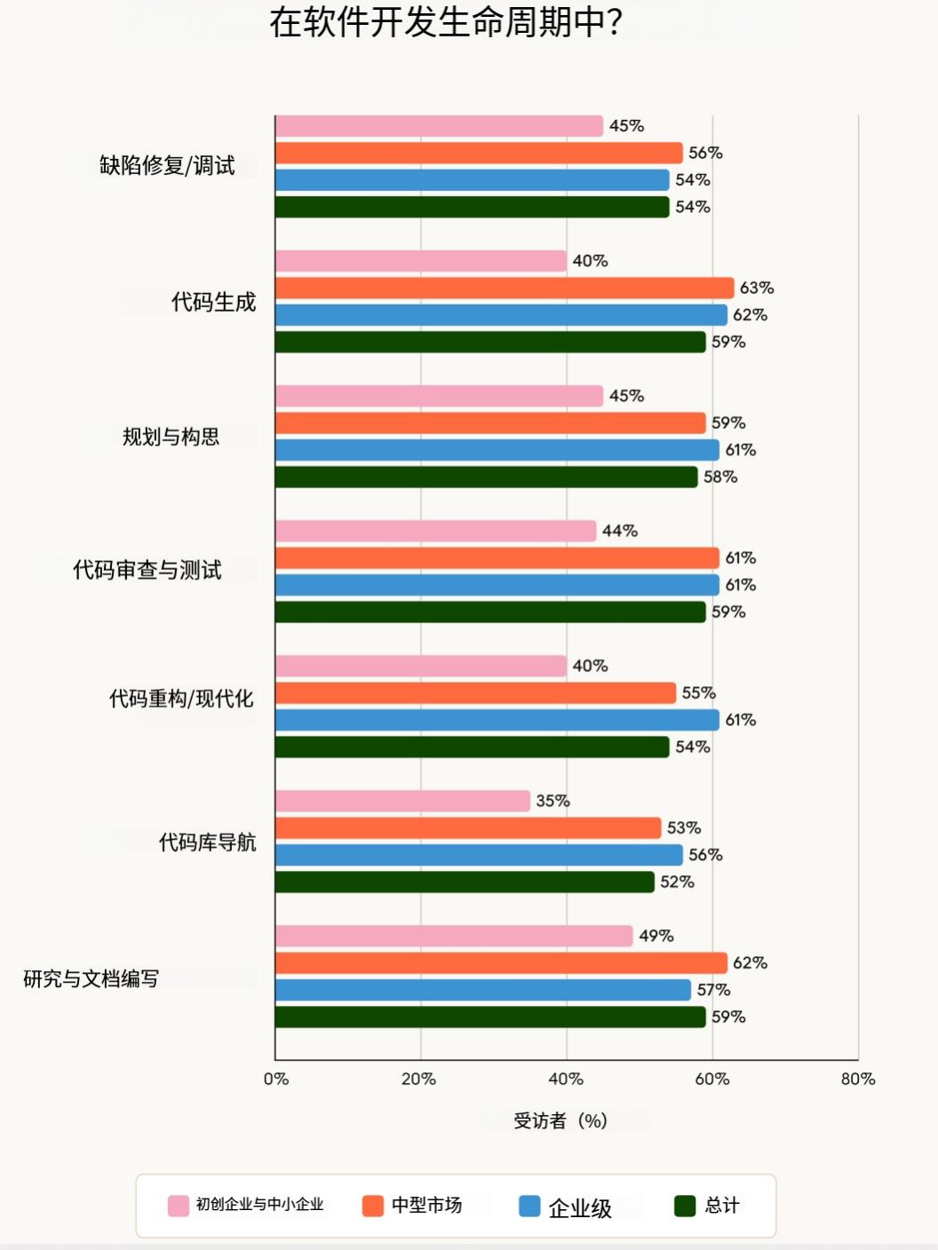 各组织报告称,人工智能智能体在整个开发生命周期中节省了更多时间 —— 从规划和构思阶段(占 58%)到代码生成、文档编写、测试和审查阶段(均占 59%)。