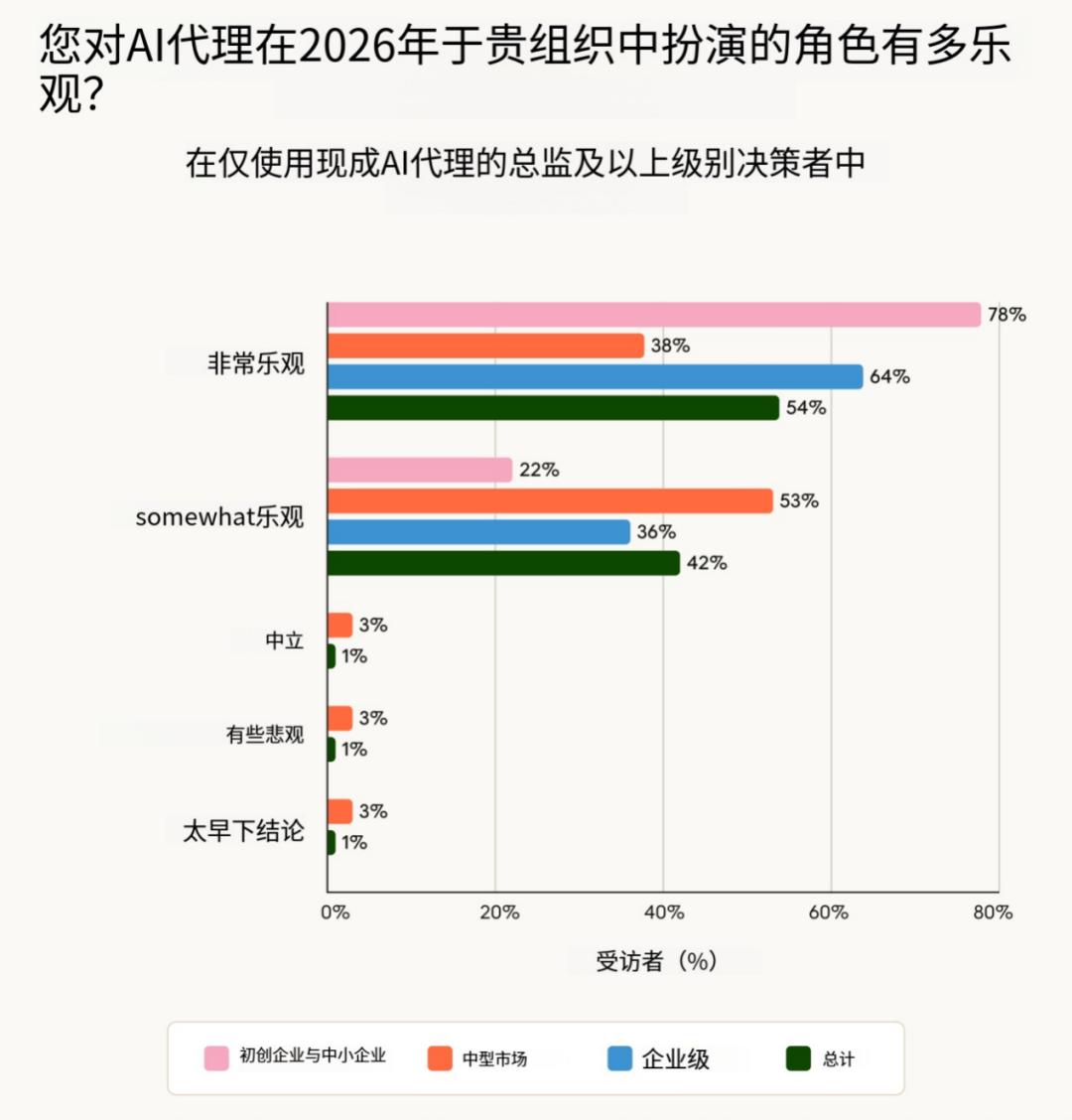 企业的乐观态度是一个重要信号,因为大型组织通常行动更为谨慎 —— 它们的评估周期更长,治理要求更严格,对价值证明的标准也更高。当企业表达出强烈的信心时,这表明它们看到的是规模化的成果,而不仅仅是试点项目中的成效。它们的积极态度也往往会影响更广泛的市场:企业的采用会推动供应商在安全、合规和集成能力方面加大投入,而这些最终会使各种规模的组织都从中受益。