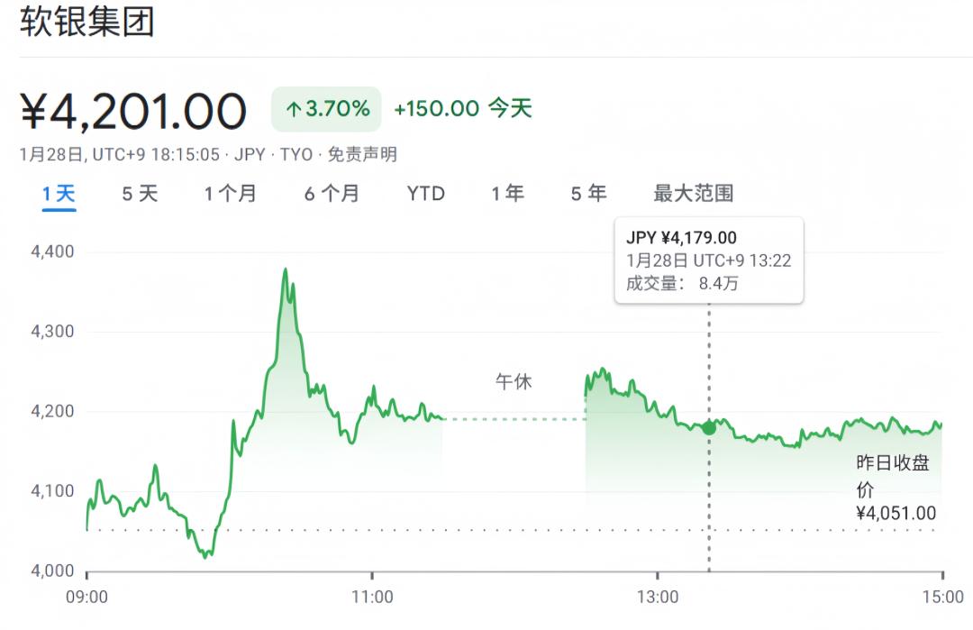 消息传出后,软银昨天的股价一度飙升8.8%,随后涨幅收窄,今天在东京交易时段上涨约3.7%。