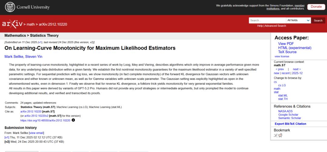 在数学和统计学领域,这种趋势已经开始显现。外媒Tech Crunch提到,去年12月发表的一篇统计学论文《关于最大似然估计的学习曲线单调性(On Learning-Curve Monotonicity for Maximum Likelihood Estimators)》,该论文利用GPT-5.2 Pro模型,完成了对核心公理的新证明,而人类研究人员仅负责提示和验证模型的工作。