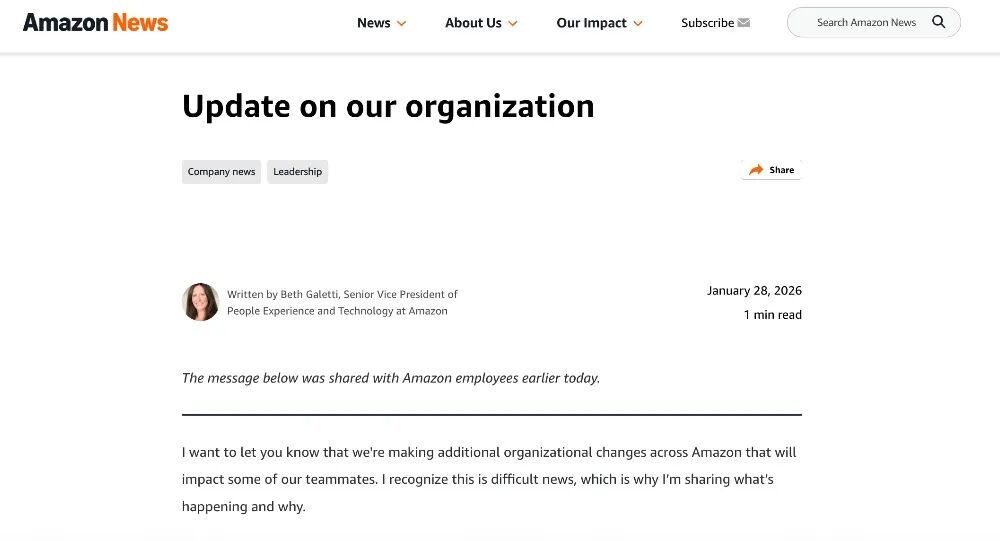 Beth Galetti说裁员对于增强公司实力是必要的举措,亚马逊将通过“减少层级、增加所有权和消除官僚主义”来实现这一目标,不排除进一步裁员的可能性,并称一些团队将继续“酌情做出调整”。
