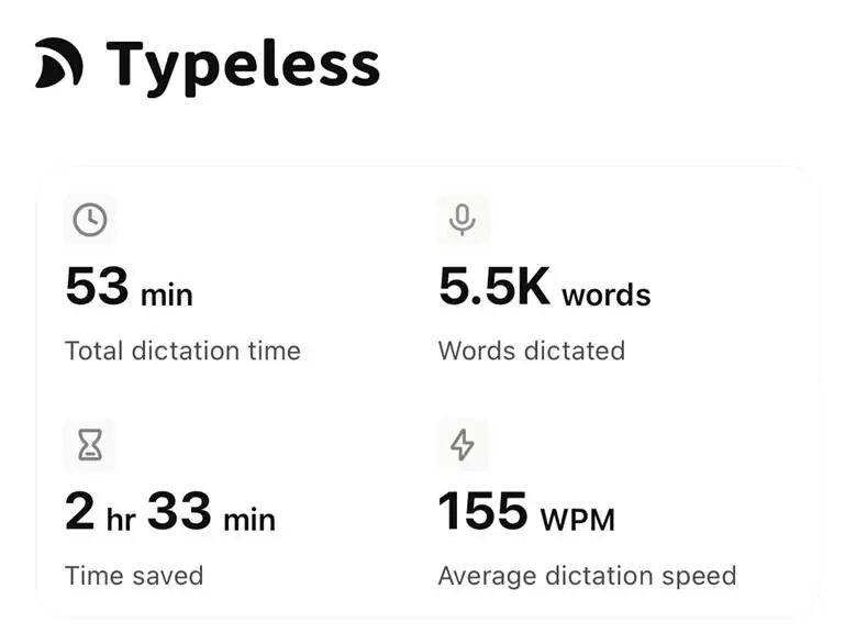 甚至连这篇文章的初稿,也是用语音输入完成的。我专门申请了另一个 Typeless 账号,记录完成这篇文稿的数据:用时 53 分钟,输入 5500 字,每分钟 155 字,节省2.5 小时。