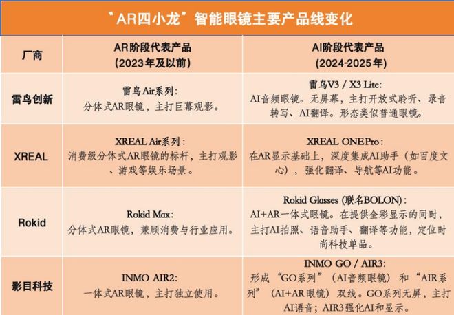 但一个明显的变化是:从2024年开始,这几家公司对外主推的产品,正在系统性地从AR 眼镜转向AI眼镜。