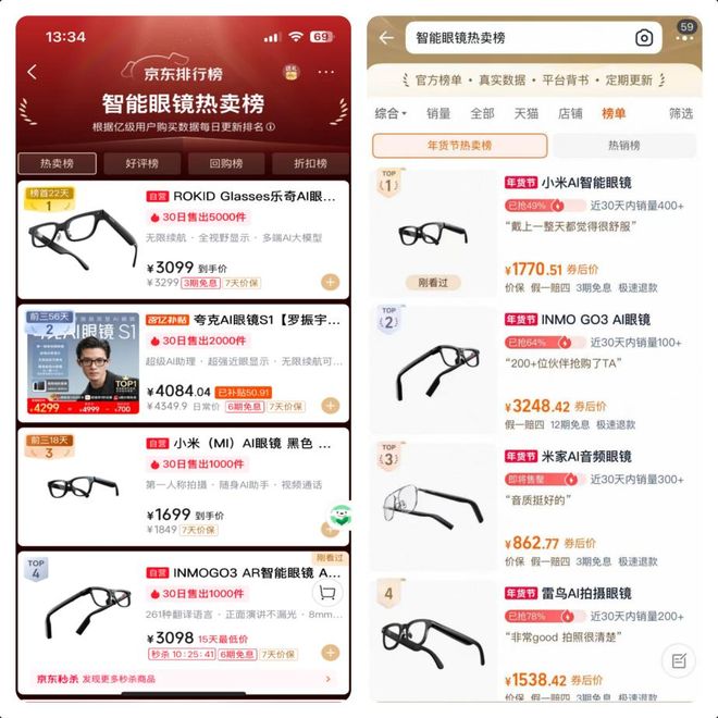 截至1月27日,京东智能眼镜热卖榜TOP30中,AI眼镜占比接近九成。其中ROKID Glasses乐奇连续22天排名第一,小米AI眼镜、INMO GO3、雷鸟V3、夸克S1等也稳定进入前十,淘宝榜单的结构基本一致。