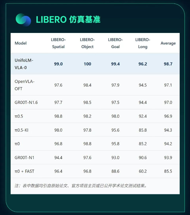 宇树在 UnifoLM-VLM-0 模型的基础上集成了动作预测头 (ActionHead),从而构建出 Uni-foLM-VLA-0。经由仿真环境与真机实验的多任务训练验证,结果显示该模型具备单模型处理多任务的通用能力,在 LIBERO 仿真基准测试中,宇树的多任务模型取得了接近最优的性能。
