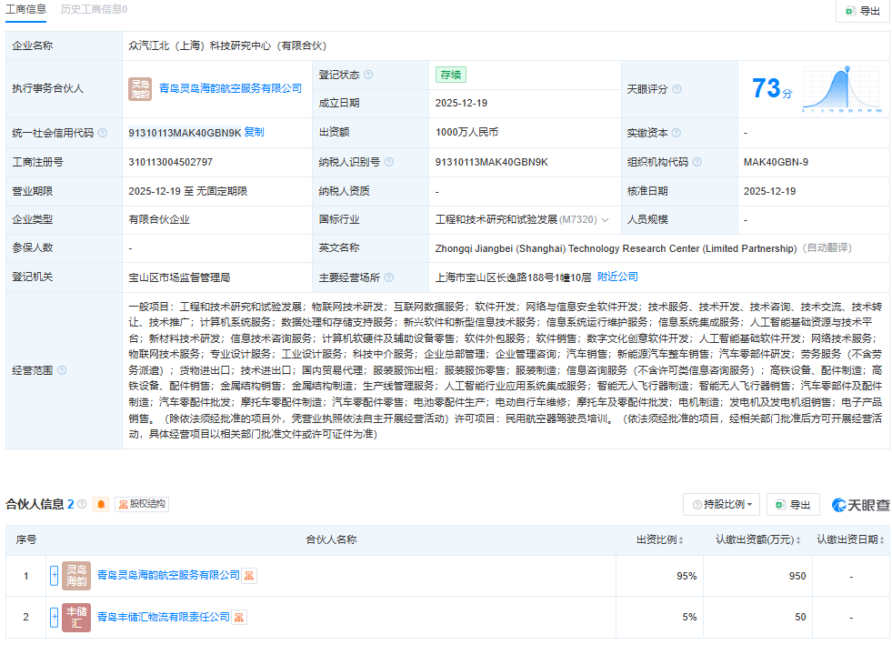 根据天眼查数据,其控股股东为众汽江北(上海)科技研究中心(有限合伙),成立于2025年12月19日,位于上海市宝山区,主要从事工程和技术研究和试验发展,企业规模为中型。上海科技研究中心对济南制造公司的持股比例为95%,认缴出资额为28500万元人民币。这意味着上海科技研究中心是济南制造公司的实际控制方。