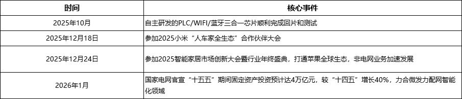 而参加智能家居市场创新大会并打通苹果全球生态,是非电网业务加速发展的关键一步,进一步扩大了公司的业务版图和客户群体。此外,国家电网“十五五”固定资产投资的增加,为力合微发力配网智能化领域带来了机遇,公司可以凭借自身技术优势,在电网业务上实现从弱到强的发展,有望在未来获得更多的市场份额和经济效益。总体而言,这些事件推动力合微在技术和业务上不断进步,提升了公司的核心价值和市场竞争力。