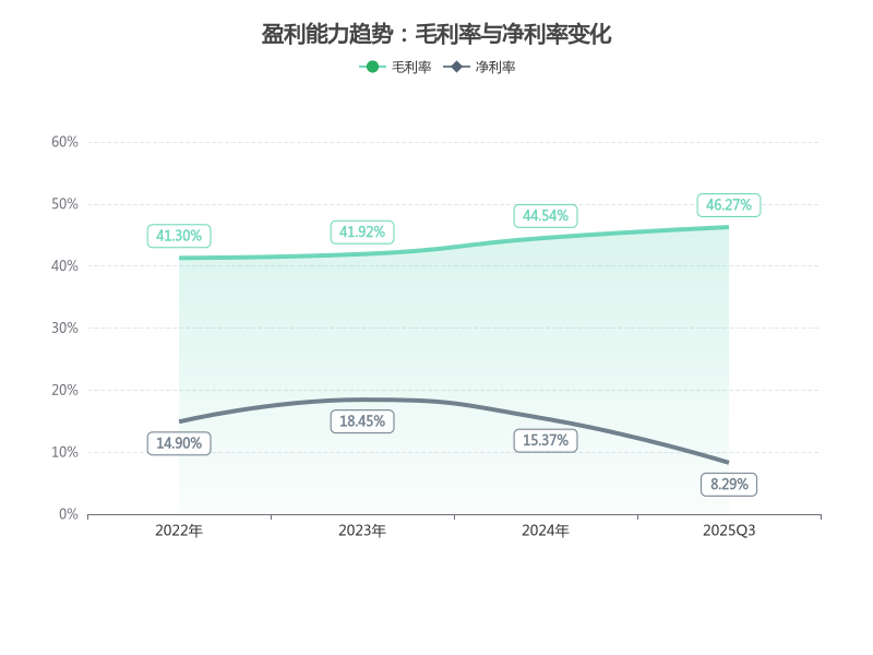 2025年Q3力合微盈利质量呈现“毛利率提升、净利率下滑”的分化特征,数据异常与经营策略的关联紧密。毛利率从2024年的44.54%升至46.27%,创近四年新高,主因产品结构优化与成本控制:高毛利PLC芯片占比从60%提升至72%,带动毛利率上升2.52pct;原材料集中采购降低成本1pct,叠加核心专利技术壁垒(20项核心专利),毛利率高于行业均值5.8pct。