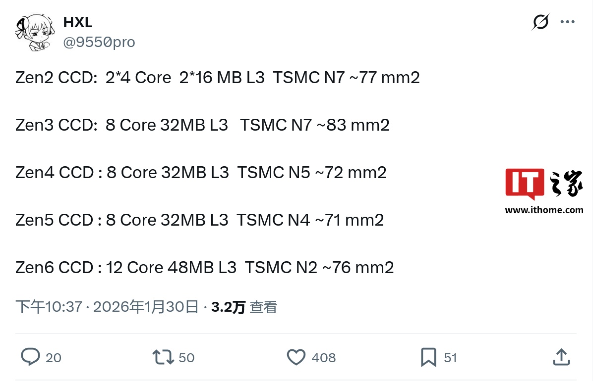 IT之家 1 月 31 日消息,消息人士 HXL (@9550pro) 昨日分享了 AMD "Zen 6" 微架构标准变体 CPU CCD 芯片的多项规格数据。