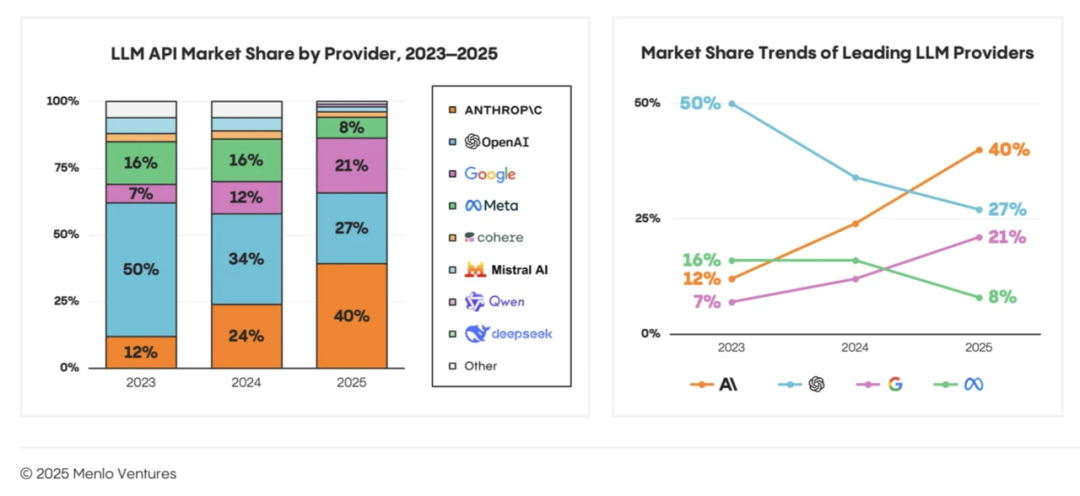 Menlo Ventures发布的2025年AI报告显示,Anthropic发展势头强劲,已经占据了企业市场份额的榜首,达到40%的惊人份额。