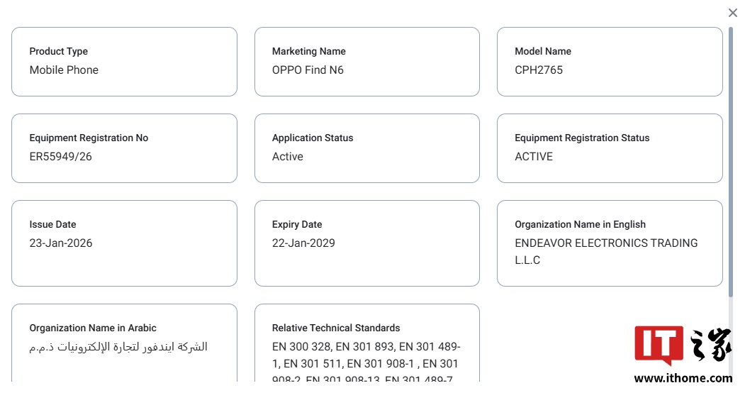 IT之家 2 月 2 日消息,OPPO Find N6 折叠屏手机现通过阿联酋 TDRA 认证,该设备的型号为 CPH2765、注册号 ER55949/26,有望近期在海外上市。