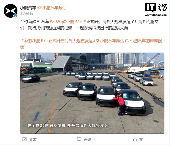 IT之家 2 月 2 日消息,据小鹏汽车官微消息,全球首款 AI 汽车 2026 款小鹏 P7+ 正式开启海外大规模发运。
