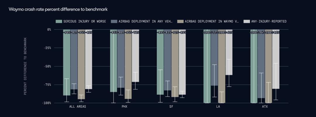 比如,如上图所示,Waymo对比了其自动驾驶系统和人类驾驶员基准碰撞率在不同地点之间的百分比差异,并附有95%的置信区间。负值表示Waymo 自动驾驶系统相比人类驾驶员减少了碰撞事故。置信区间不包含0%表示该百分比差异具有统计学意义。