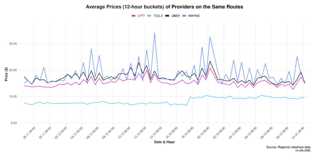 根据Obi在2025年11月27日至2026年1月1日进行的调查,特斯拉Robotaxi(仍然配备安全驾驶员)的乘车价格中位数为7.39美元,Lyft的乘车价格中位数为12.99美元,Uber为14.94美元,而Waymo最高,为17.25美元。
