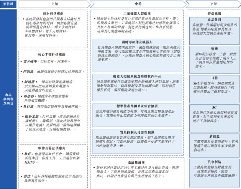 工业机器人行业上游为基础材料、核心零部件及软件供应商,参与企业包括拓普集团、三花智控、绿的谐波、双环传动、中大力德、汇川技术、固高科技等。