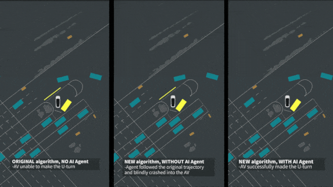 而AI主体模块的任务,就是利用AI Agent技术为驾驶员、行人、骑手等不同道路参与者构建全谱系的行为模型。完整模拟出道路场景中,从日常规范驾驶到高风险鲁莽行为的所有可能性。以下图为例,AI主体模块就优化了自车在调头场景的决策能力。