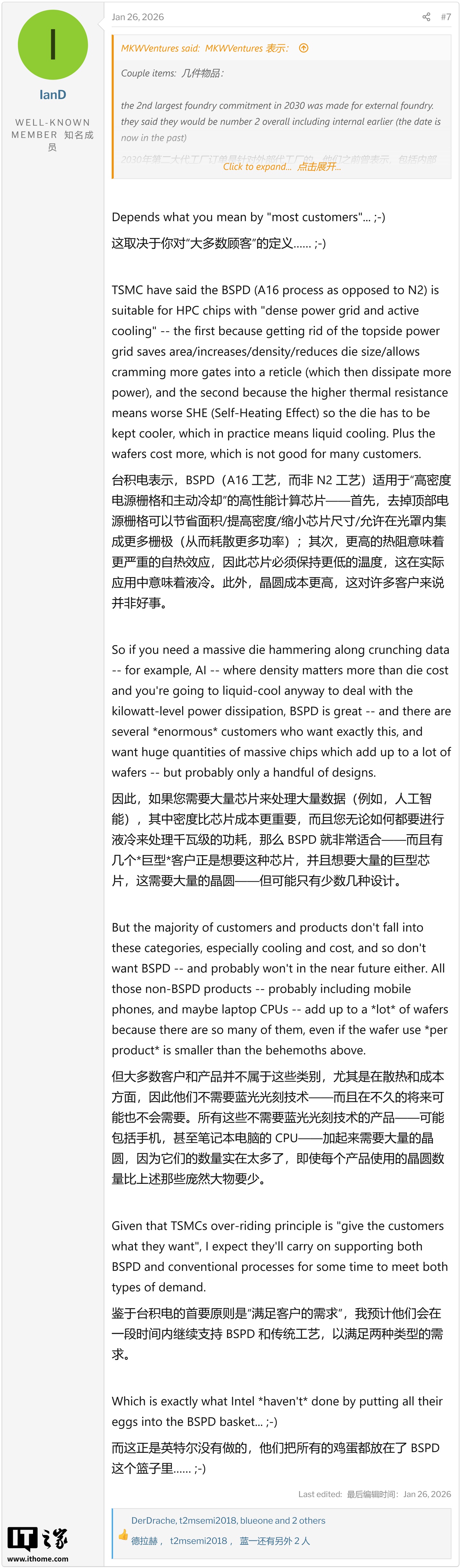 行业专家 IanD 指出在保持相同芯片核心温度(Hotspots)的前提下,采用 BSPD 技术的芯片需要散热器温度降低约 20°C 才能维持热平衡。IT之家附上相关截图如下: