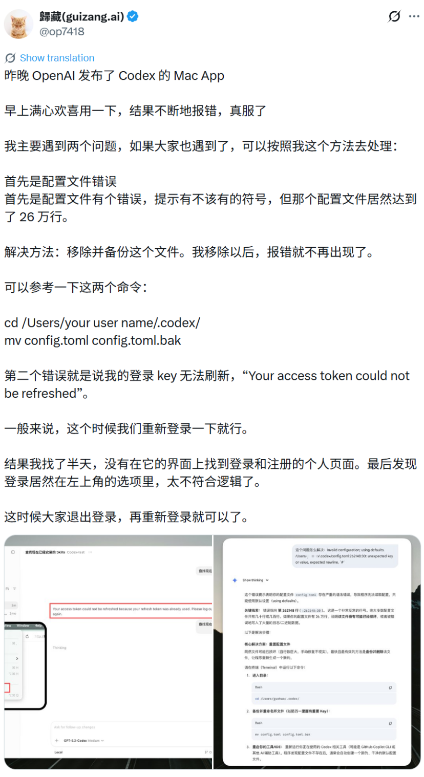 不过,这款应用的初期表现似乎并不完美。知名中文AI博主歸藏在社交平台上分享了他的初体验。他提到在发布当晚满心欢喜地安装使用,结果遇到了持续的报错问题。