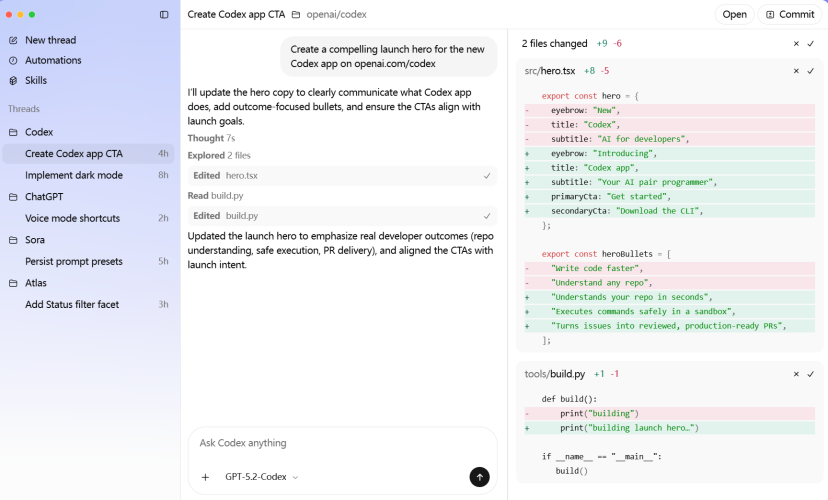 OpenAI将Codex应用定位为“agent式编程的指挥中心”。应用内置了工作树和云端环境,允许多个AI agent在不同项目间并行工作。