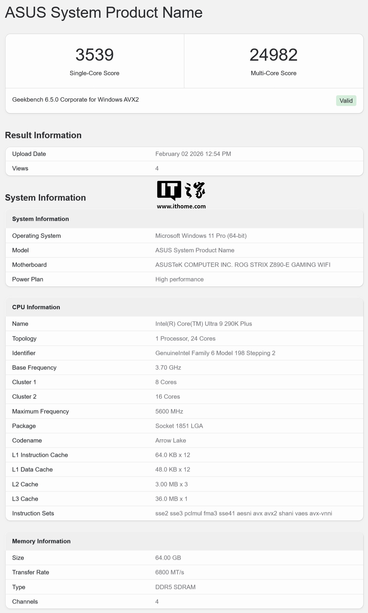 IT之家 2 月 3 日消息,科技媒体 Tom's Hardware 昨日(2 月 2 日)发布博文,报道称英特尔酷睿 Ultra 9 290K Plus 处理器现身 GeekBench 跑分库,6.5.0 版本单核成绩为 3535 分,多核成绩为 25106 分。
