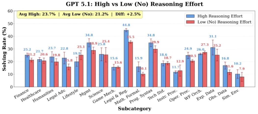 对部分模型来说,增加推理强度可以改善表现,使模型更深入地理解复杂上下文。例如,GPT-5.1在管理类和实验数据类任务上的表现提升约6%,但其他模型提升有限甚至可能下降,说明单靠更多推理并不足够,模型还必须能够正确吸收和组织上下文信息。
