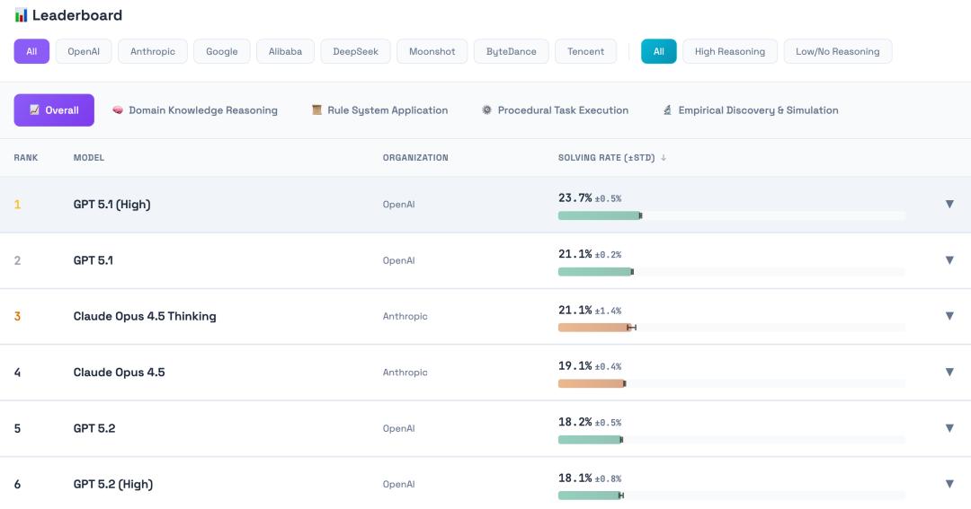 平均来看,模型仅解决了17.2%的任务,其中GPT-5.1(High)解决了23.7%的任务。