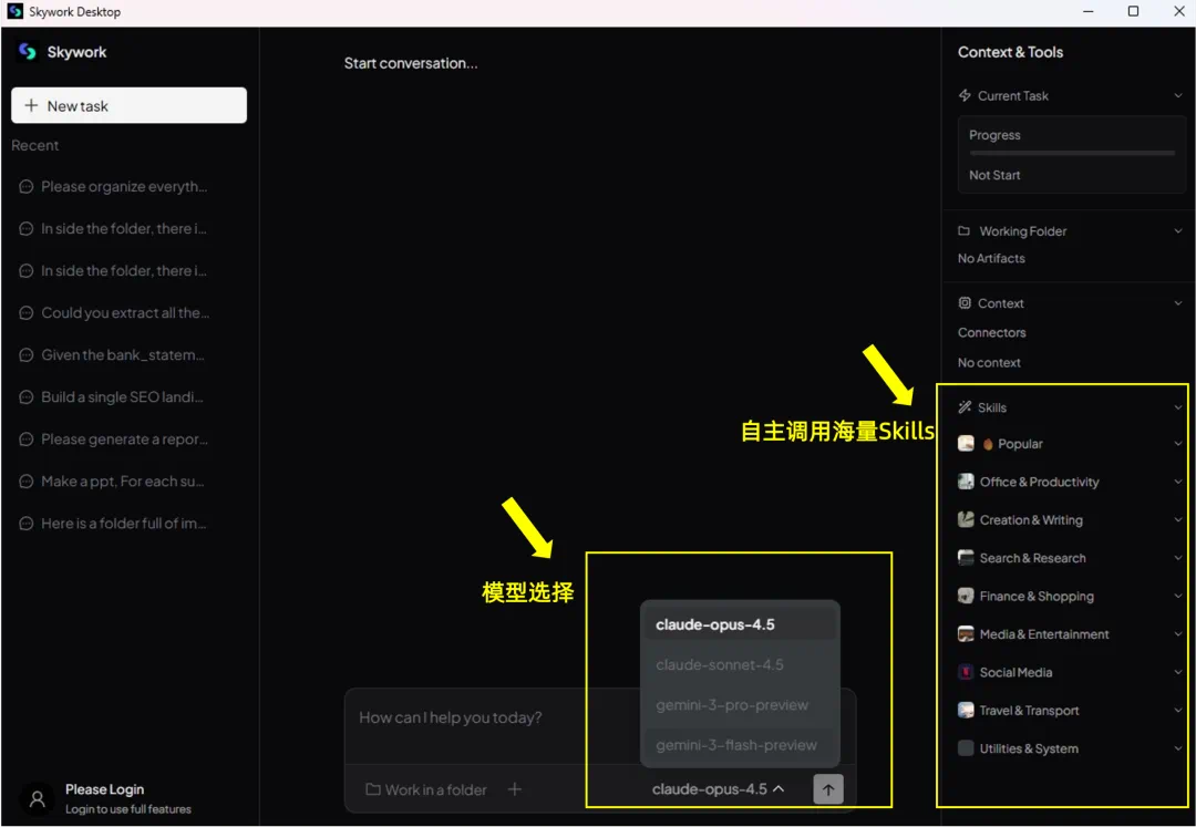 据介绍,该桌面版支持Windows系统,可理解并处理图片、视频、表格、PPT等多种格式的文件。在模型支持上,用户可选择Claude Opus 4.5、Claude Sonnet 4.5或Gemini 3 Pro模型,也可由系统自动推荐。应用内置超过100个Skills(技能),用于处理办公、内容生成等任务。