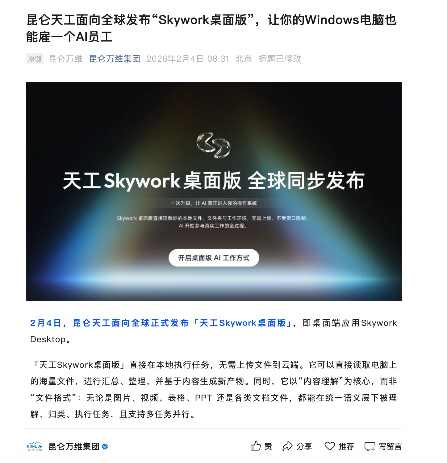 凤凰网科技讯 2月4日,昆仑万维正式发布桌面端AI应用“天工Skywork桌面版”(SkyworkDesktop)。该应用可直接在本地运行,读取并处理电脑中的各类文件,无需将数据上传至云端。