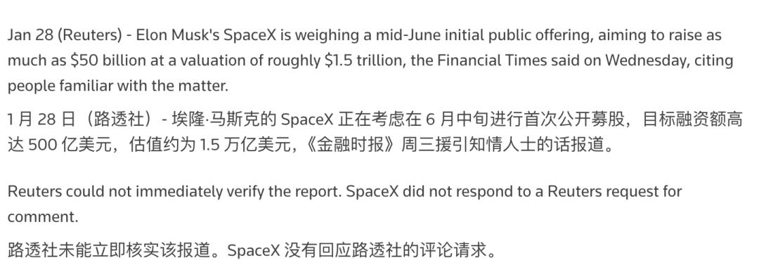 另据路透社消息,SpaceX 可能在 2026 年中推进 IPO、募资规模最高达500 亿美元、估值目标可能到1.5 万亿美元左右。不过 SpaceX 方目前对此还没给出回复。