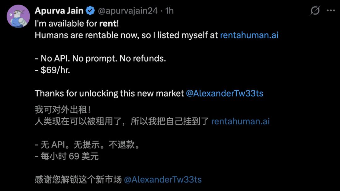 这不,一位网友Apurva Jain自称,已经把自己挂在RentAHuman.ai平台上了,时薪69美元。