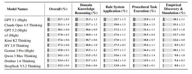 在子类别层面,差异更加明显。在规则系统应用中,法律法规类任务的解决率超过 29%, GPT-5.1 甚至达到 44.8%,但数学形式体系类任务大部分模型都在 15% 以下。