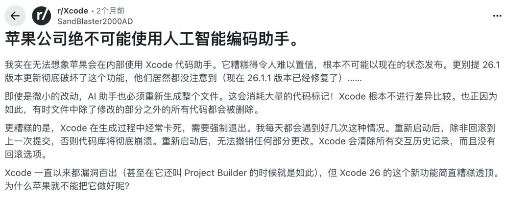 网友在体验过后疯狂吐槽新的 Xcode AI 功能|图片来源:Reddit