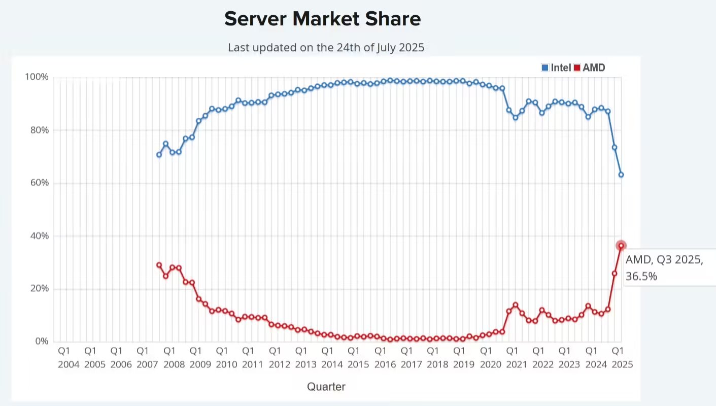 苏妈那是一点面子不给,凭借着台积电的先进工艺,核心数越做越多,价格还比英特尔便宜,整得英特尔在数据中心的份额一路狂跌,在高端算力战场上更是被挤兑得毫无还手之力。