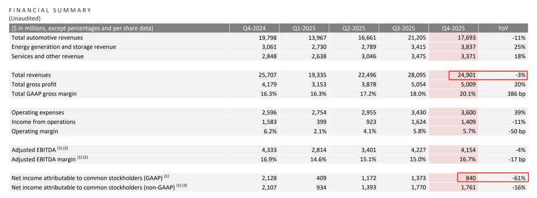 近日,特斯拉2025年第四季度财报显示,特斯拉营收249亿美元同比下降3%,净利润仅8.4亿美元暴降61%。