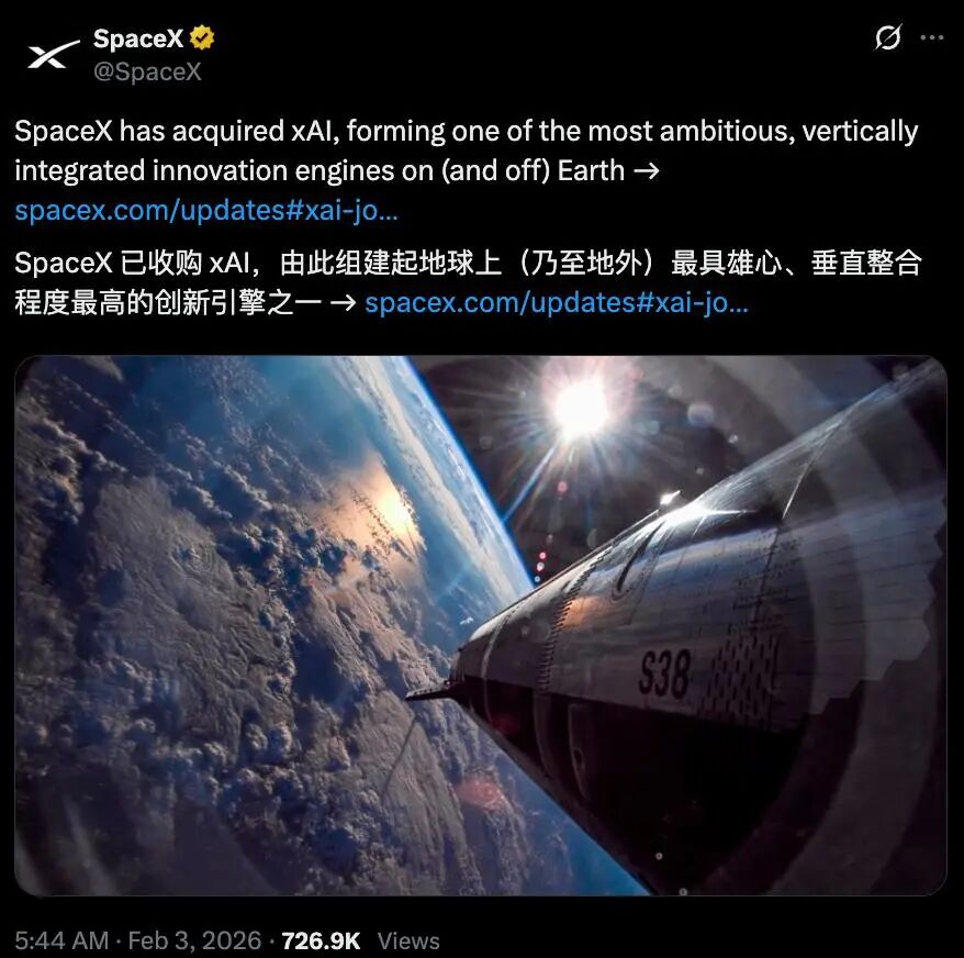 此外,马斯克最近最具爆炸性的商业动作,莫过于SpaceX正式宣布收购其一手创立的人工智能公司xAI。火箭、AI、太空互联网、卫星通信——马斯克要把能整合的全整合了。