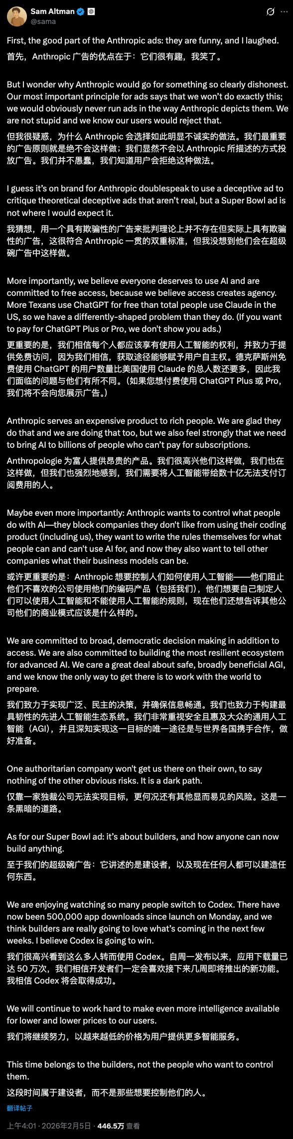 好好好,这都不是阴阳怪气,这是贴脸开大。奥特曼也不可能就这么被骂,立刻就发了长文回应:这广告好笑,但没那么好笑。