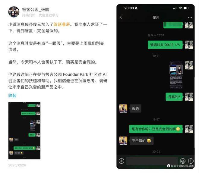 此前,网传前豆包 PC 负责人齐俊元在离开字节后加入阶跃星辰,负责手机相关业务。尽管随后极客公园创始人张鹏在社交平台晒出向齐俊元本人求证的“辟谣贴”,齐俊元以“完全假的”予以回应,但阶跃星辰官方并未对此作出任何公开说明。