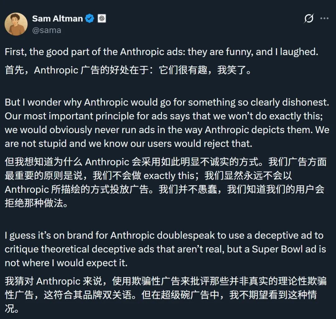 奥特曼看到Anthropic在超级碗广告的预告片后,深夜发推回击。