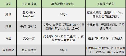 算力层面,四家巨头GPU保有量都较高,但供应链安全与成本控制是关键。百度昆仑芯M100即将量产,阿里有自研芯片真武810E(2026年1月22日,阿里决定支持旗下芯片公司平头哥未来独立上市);字节、腾讯大量采购H100等高端卡,但面临供应不稳定与价格波动风险。