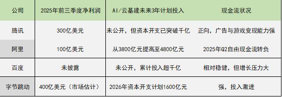 腾讯2025年前三季度利润超300亿美元,且有游戏、金融等收入和利润极好的现金牛业务打底,呈现出“高利润支撑高投入”的特点,AI可依托现有业务变现(如广告系统优化、游戏内容生成等),财务策略相对稳健,可支持长期投入。
