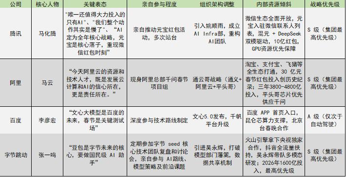 在颠覆性技术变革期,企业创始人及一把手的认知与决心往往决定企业转身的速度。目前看,腾讯正在觉醒、阿里决心最大、字节战略最清晰、百度全栈投入。